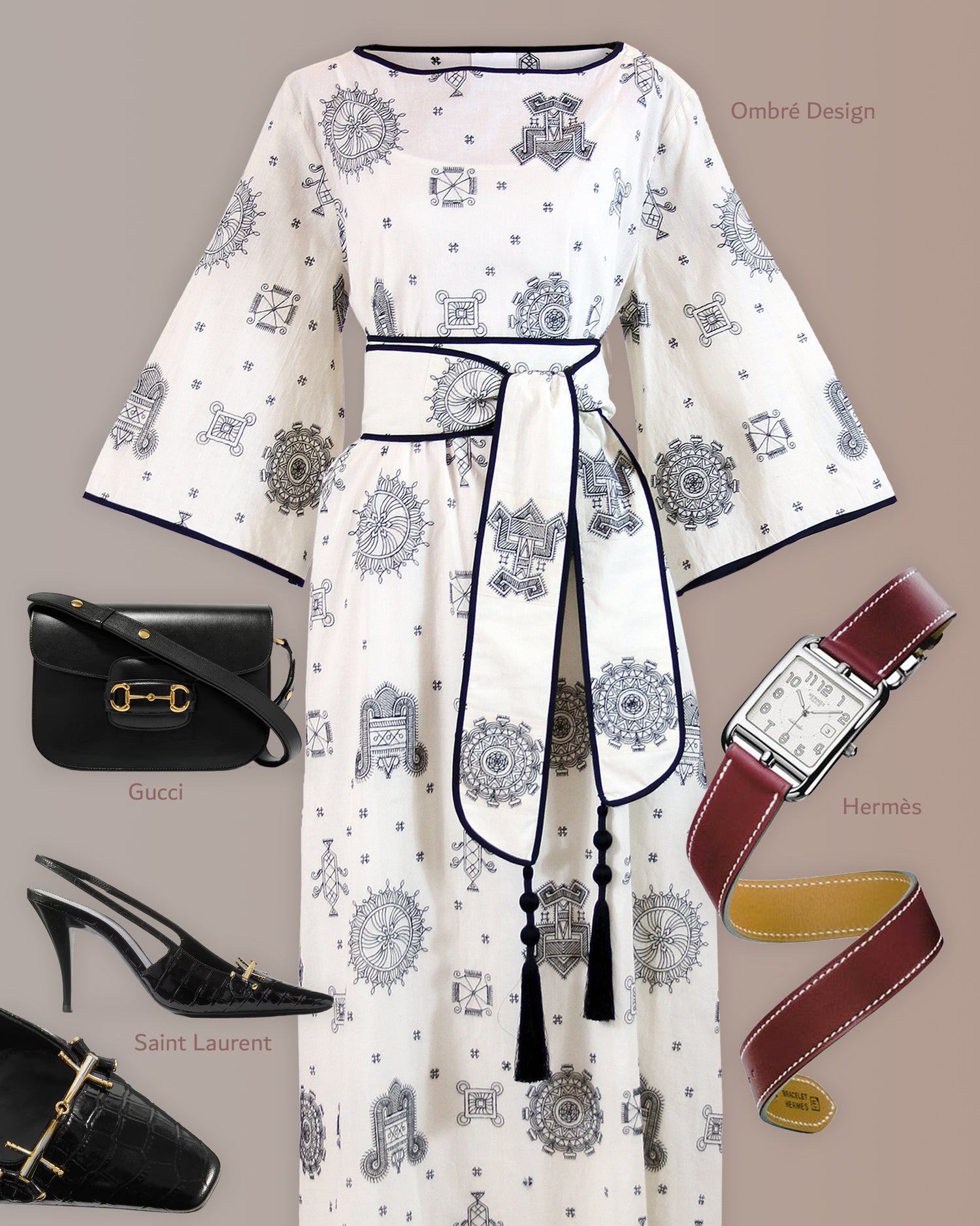 Explore our exquisite Linen Easy Breezy dresses women's collection, expertly crafted with a black and white embroidered motif technique. These dresses exude timeless charm and effortless style. Pair them with a classic black Gucci cross bag, elegant YSL black leather heels, and a sophisticated Hermes double strap watch to complete a look that's the epitome of refined grace and modern luxury.