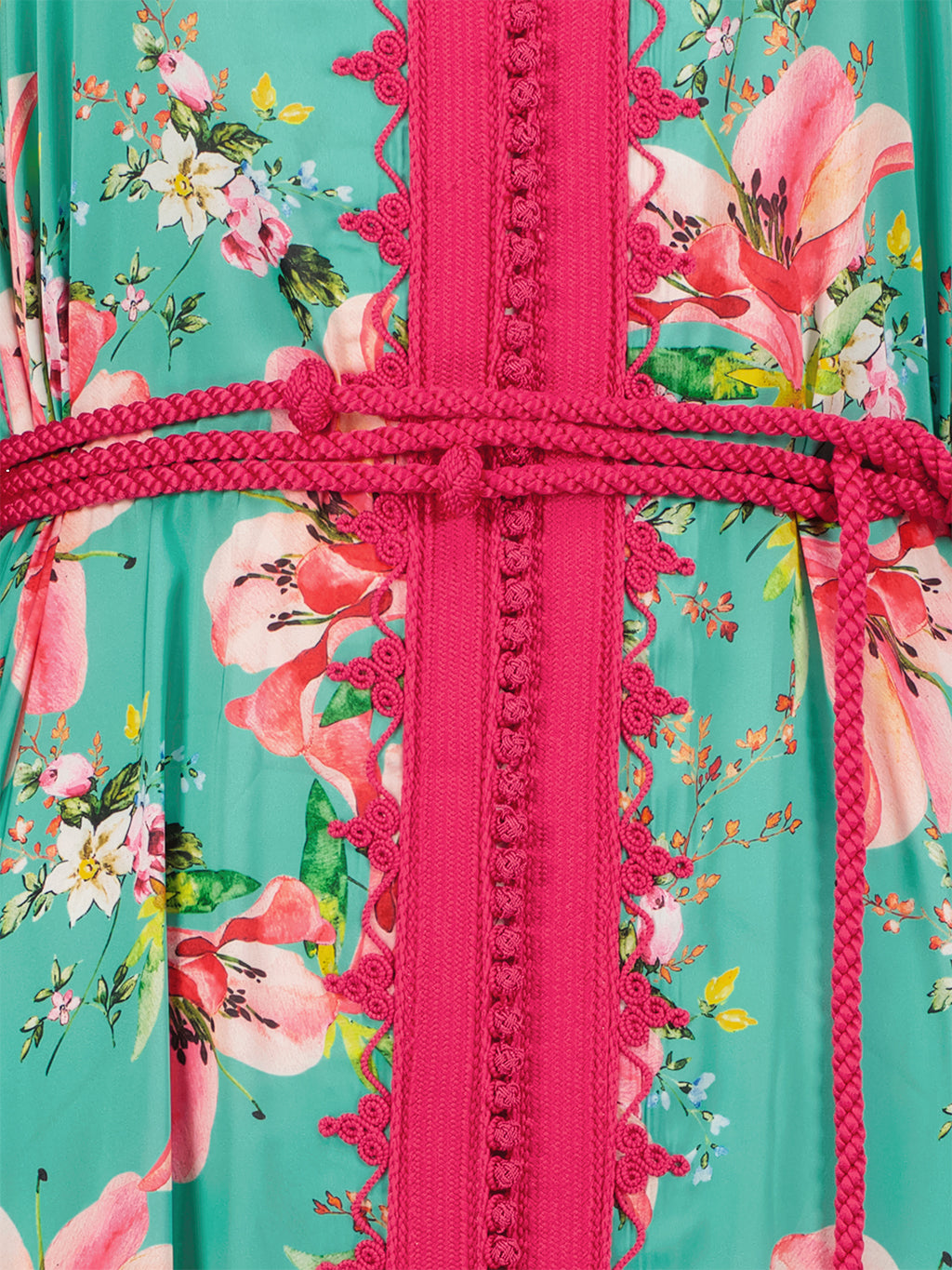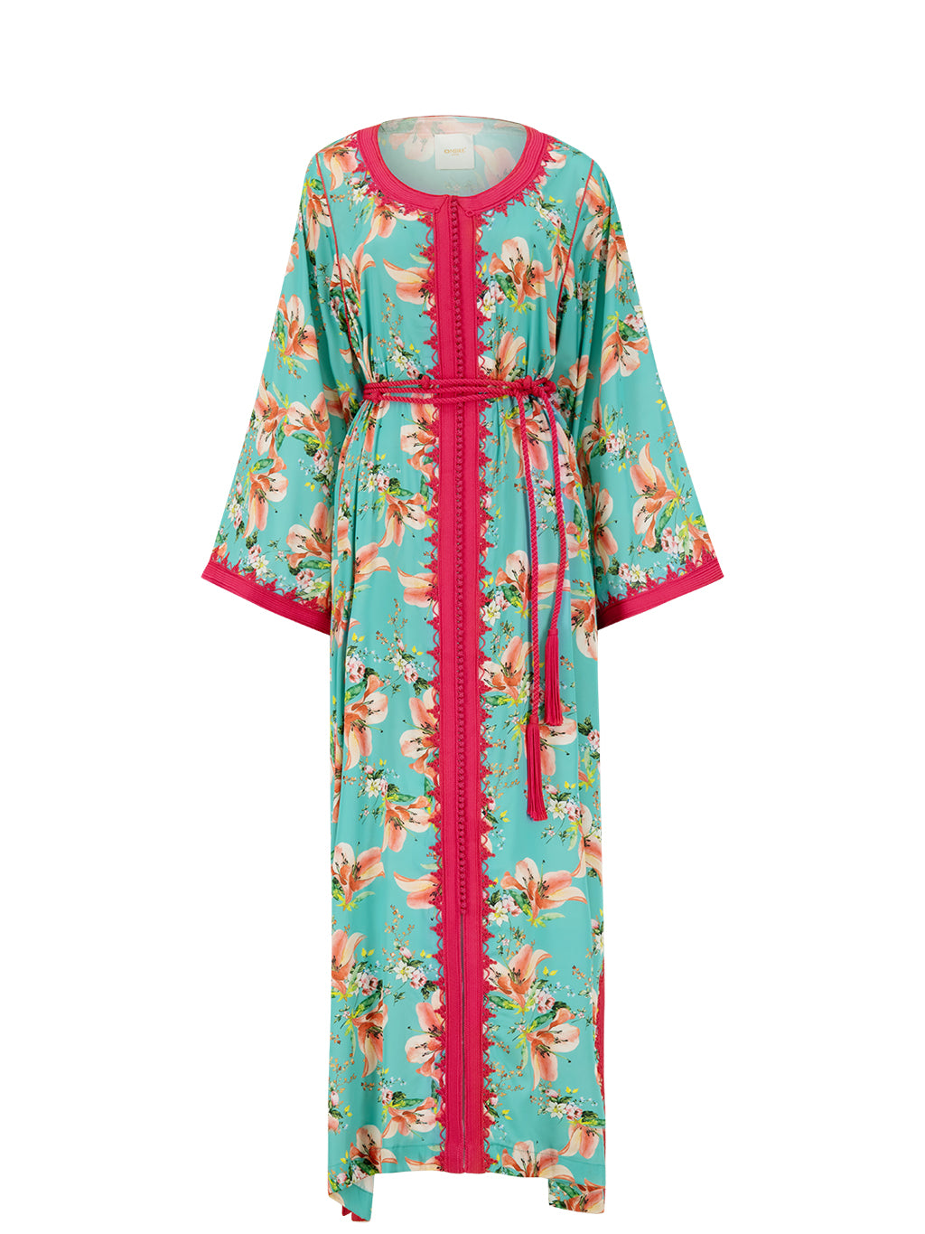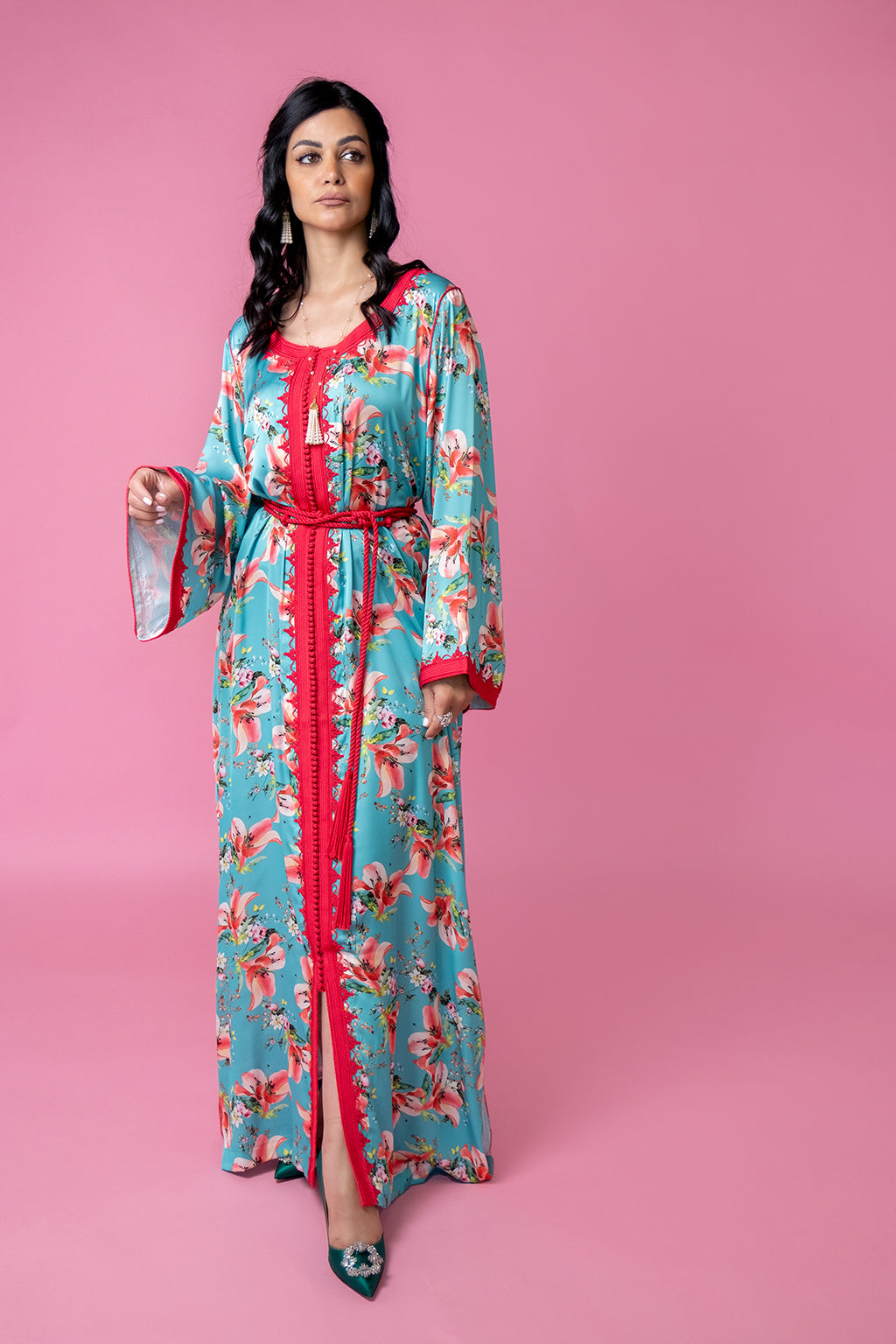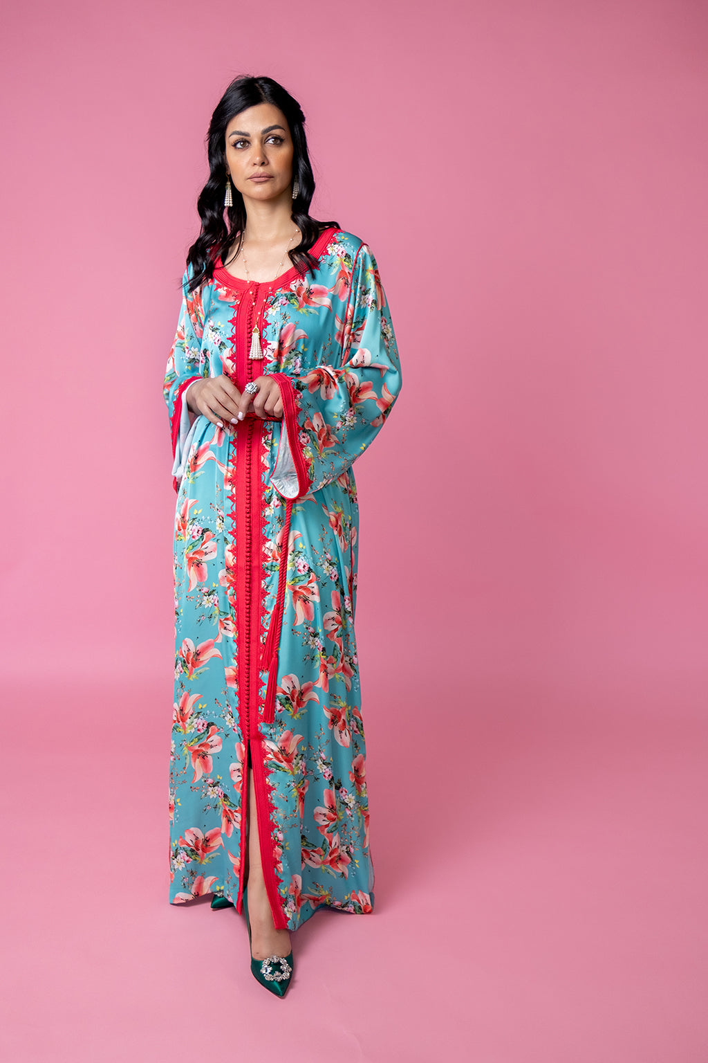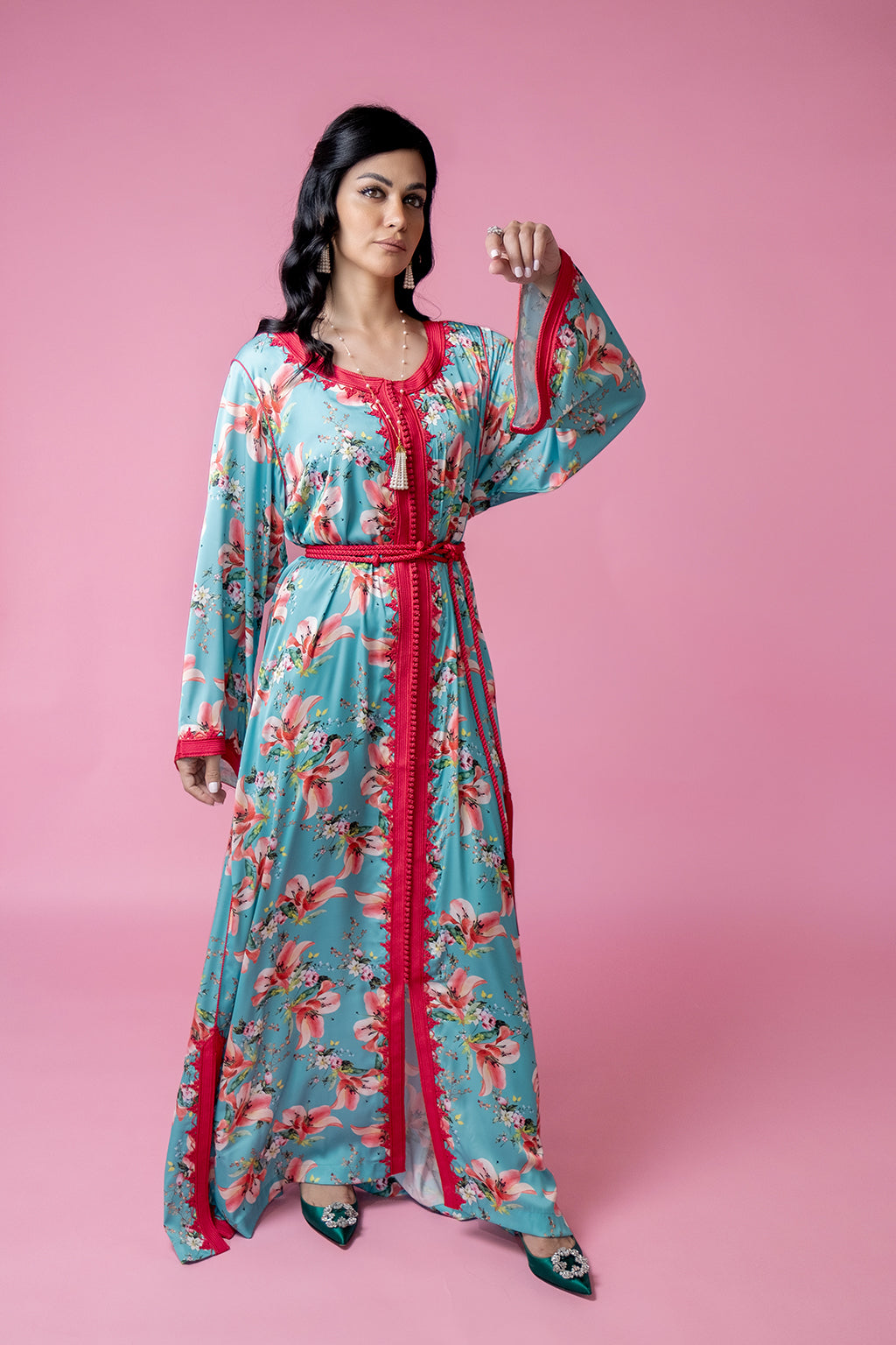 The Moroccan Silk Kaftan Collection has been made using European floral fabric designs from both France and Germany. The floral pattern is very definite and bold, while the Silk fabric is soft, light, and delicate, which makes it suitable to be worn during summer days.