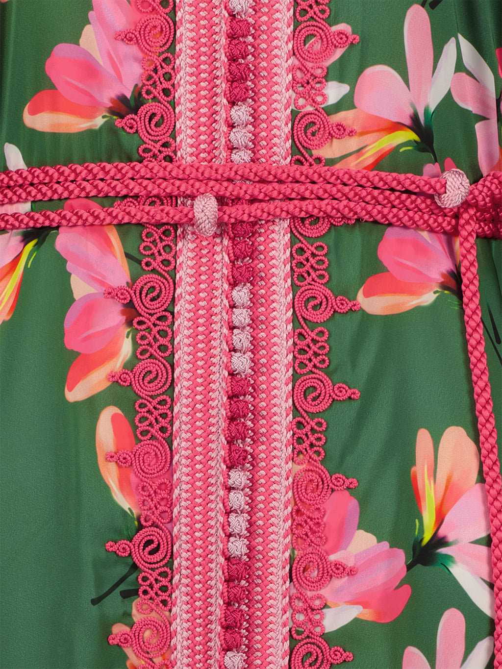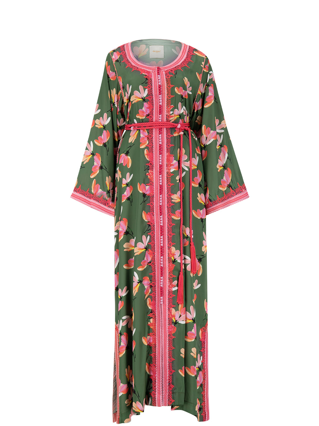 This piece of the Moroccan Silk Kaftan Collection has been made using European floral fabric designs from both France and Germany. The floral pattern is very definite and bold, while the Silk fabric is soft, light, and delicate, which makes it suitable to be worn during summer days.