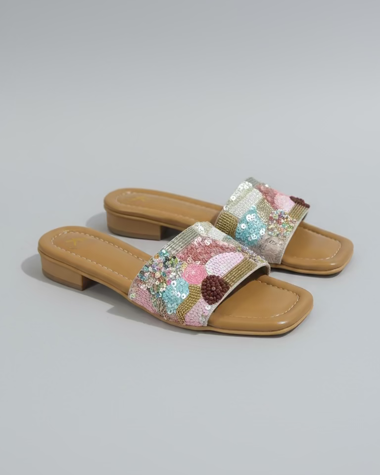 Hand-embroidered uppers crafted from soft, sustainably sourced fabrics such as cotton-silk blends, paired with pure leather linings tanned using plant-based dyes.