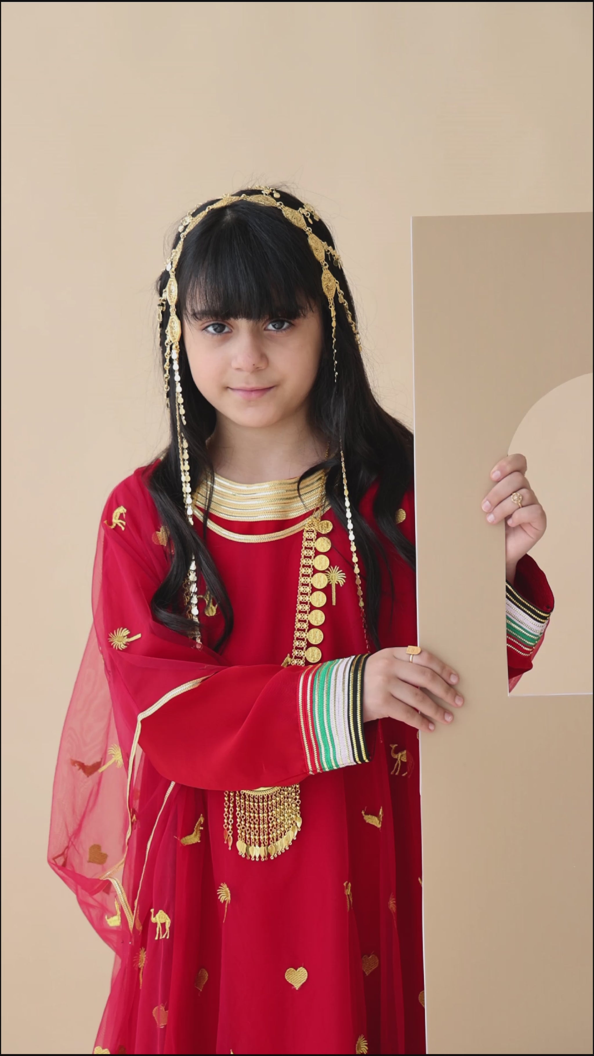 Our Ready-to-Wear line, meticulously designed using two UAE flag colors, off-white and red, which comprises a complete outfit with two distinct parts: the inner Talli jalabiya and the outer custom tulle fabric dress adorned with an original embroidery pattern.